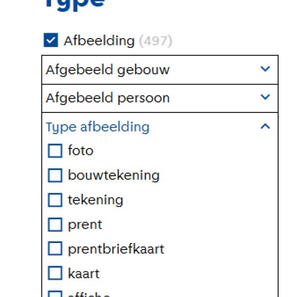 (NB: deze filterlijst is niet uitputtend, dus het loont altijd om ook via 'vrij zoeken' op een gebouwnaam te zoeken);Afgebeeld persoon: als je wilt zoeken naar beeldmateriaal van een specifiek persoon